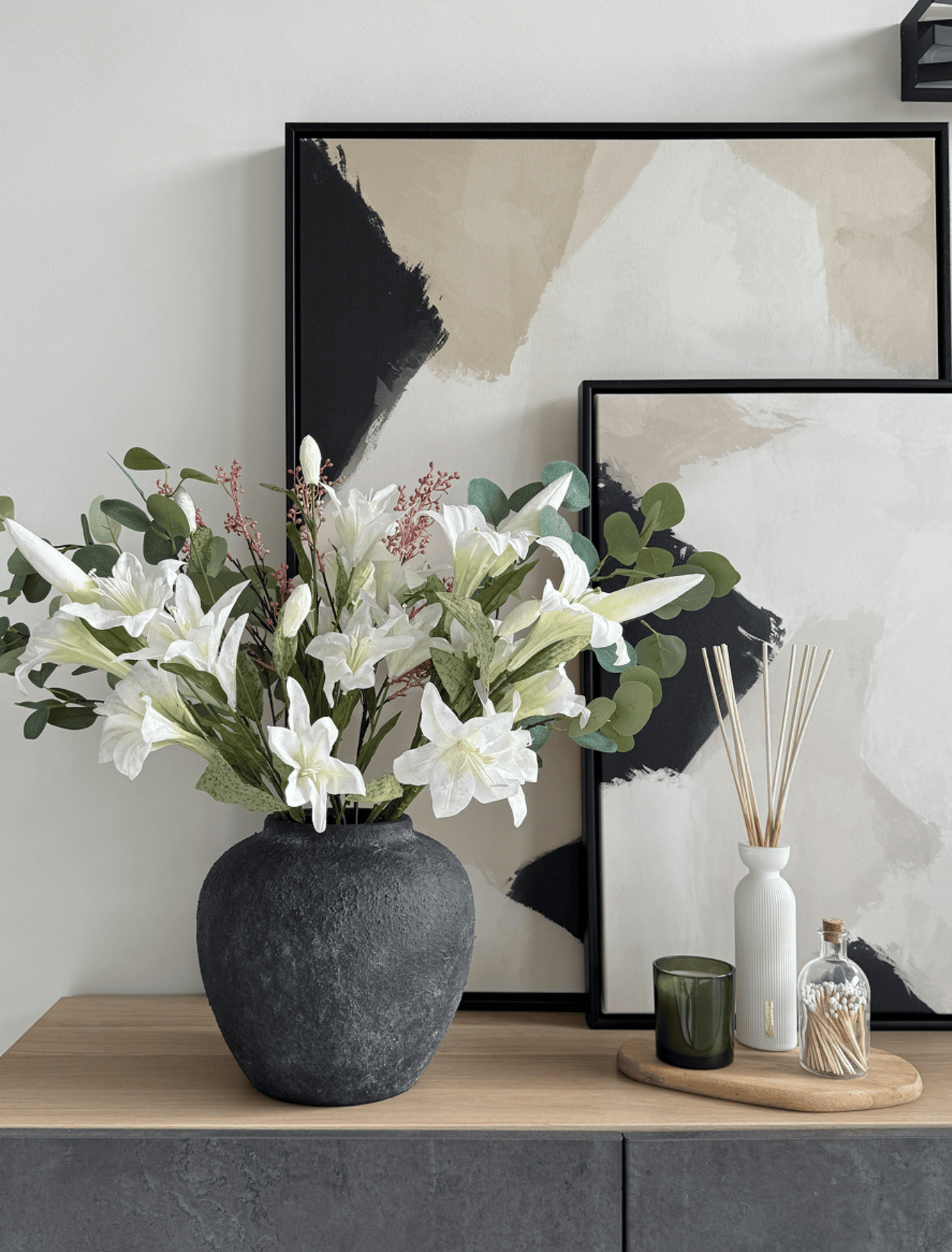 Want florist-worthy flowers year round? Add a touch of luxury to your home with this stunning Faux Spring Arrangement. Beautiful White Lily's sit nestled between lush green Eucalyptus to create this stunning faux arrangement.