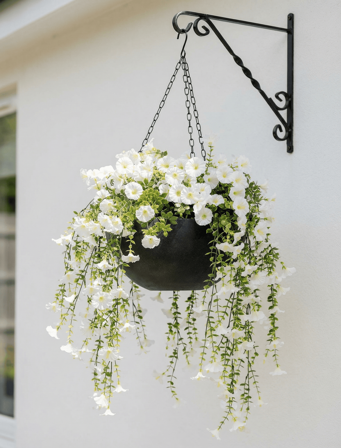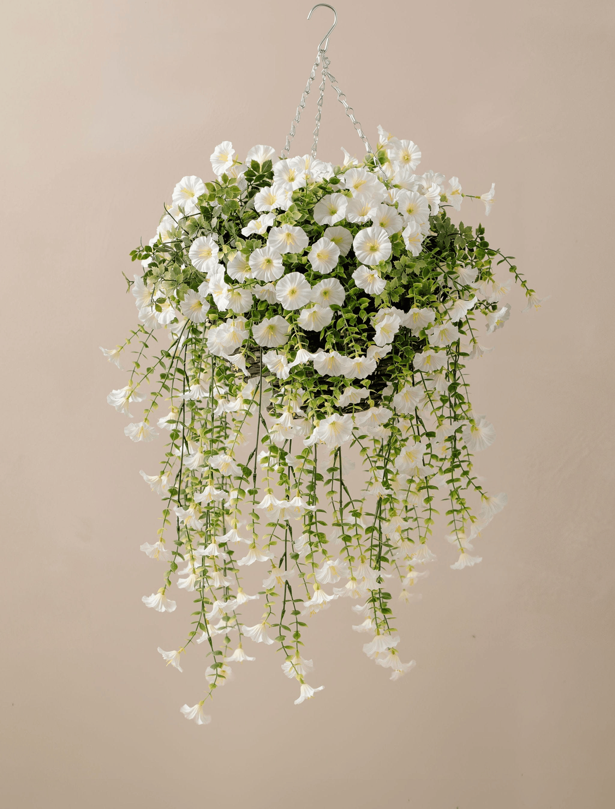A classic hanging basket featuring white petunias nestled amongst fresh green foliage. Bright and uplifting, this arrangement brings effortless charm to your outdoor space all year round.